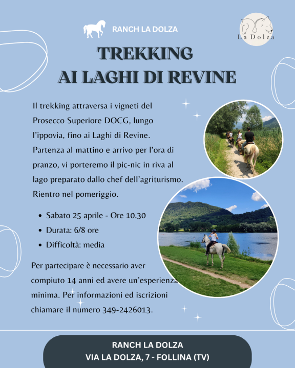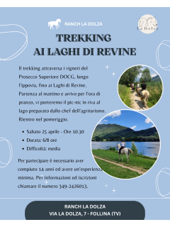 Partiendo por las escuderias de La Dolza a caballo y acompañados por Enrico, experta guía ecuestre, se puede recorrer el espléndido valle, denominado Valsana, que desde Vittorio Veneto se extiende hasta Valdobbiadene, llegando a los Lagos de Revine en menos de 3 horas.
